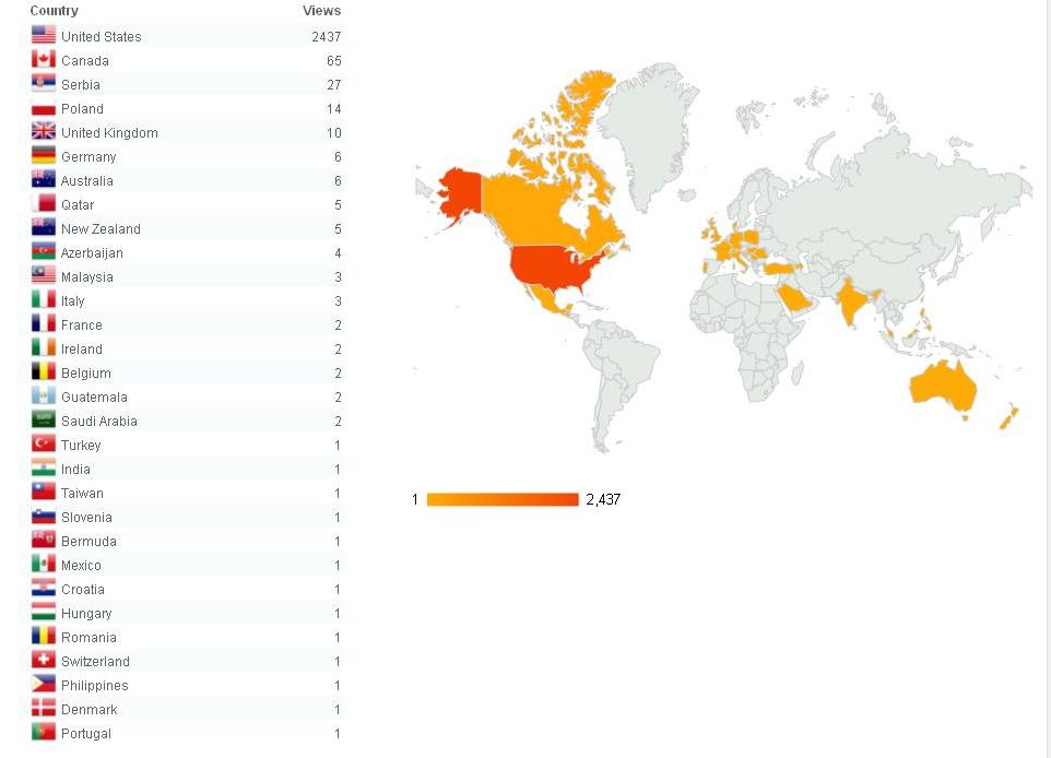 So WordPress has cool functions for me (the blogger) to see all kinds of stats. This is my all time favorite one. It shows me number of views in each country around the world. So in two months, I have people that span the globe looking at what I am doing. That’s pretty cool. Some of the countries, I can actually name someone that I physically know that lives there. The rest are just stumbling upon my blog and that’s neat. So the engineer in me loves data and that’s a bunch of fun pretty picture data to boot.