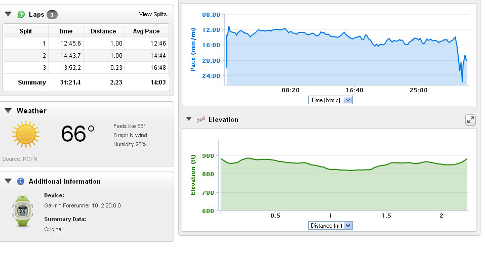 LOOK AT THIS!!!!!  I kept it slow and steady and right at 2 miles (just over) plus avoided big hills.  I walked up the last hill because it shot up to the parking lot and I knew my PT would fuss at me for running that one.   So to give you a comparison to where I was 3 weeks ago, here is my run right before I started physical therapy.